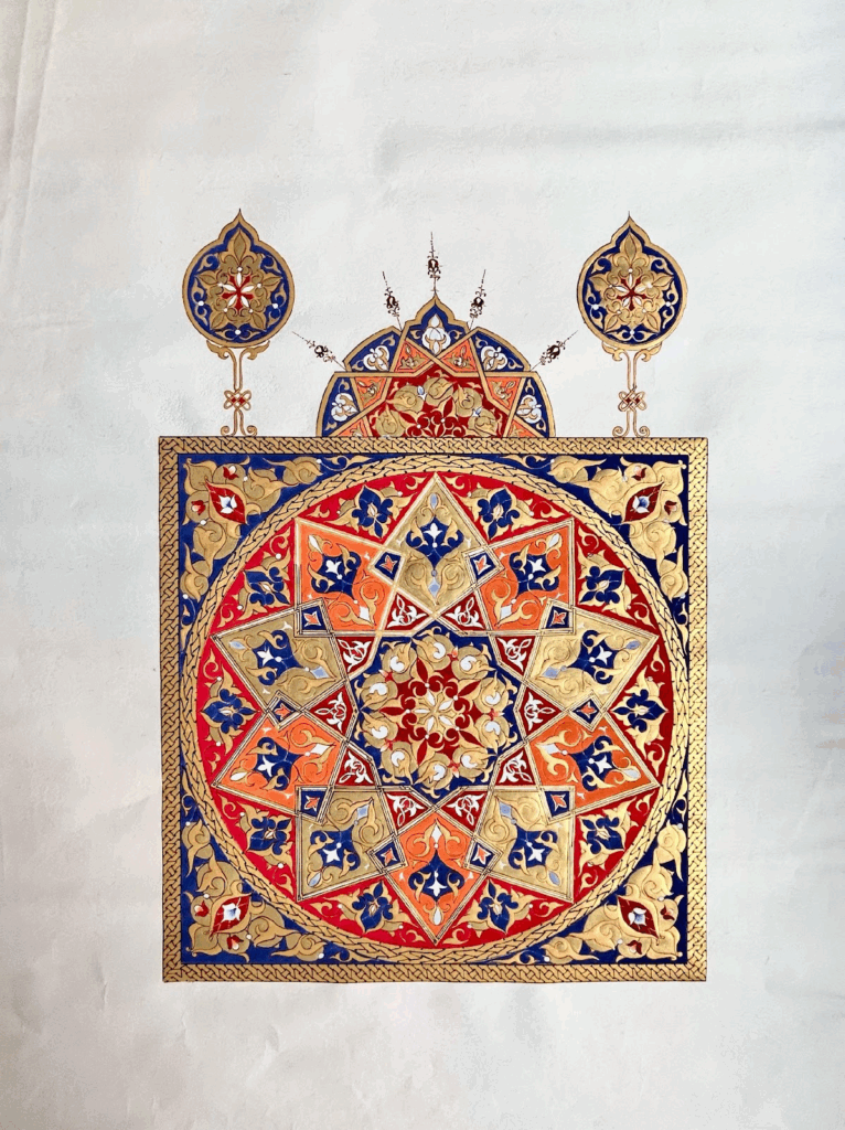 This artwork is a refined example of Moroccan illumination—a traditional art that blends precise geometry, rich ornamentation, and symbolic color. It reflects the timeless heritage of Islamic art, where harmony between mathematics and beauty creates patterns that evoke both the material and the spiritual world.
