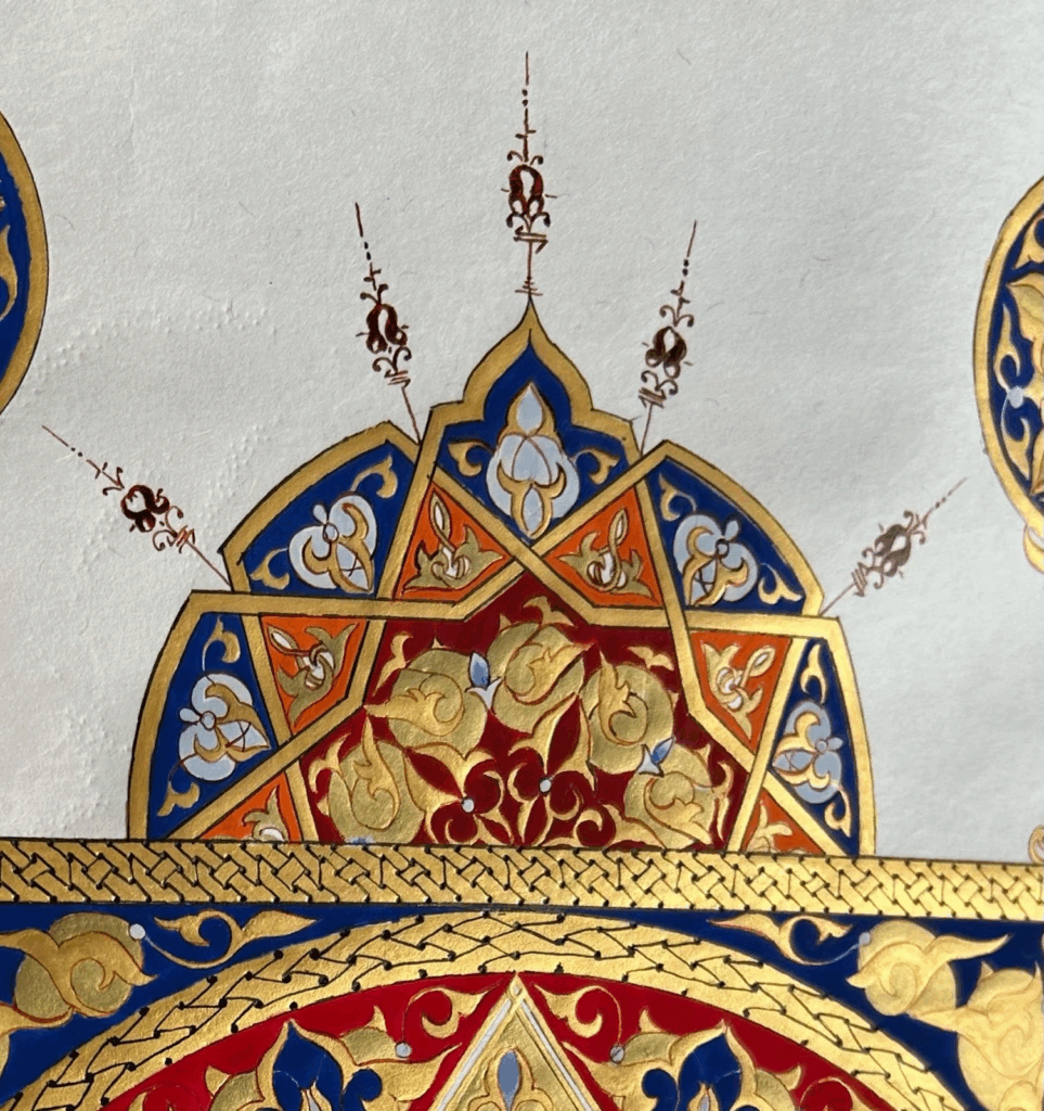 Color & Sy ornaments, finely drawn in brown-red ink. These add elegance, movement, and height, emphasizing the Kubba’s role as a crown.